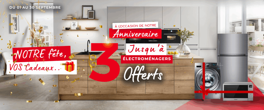 Plus on célèbre, plus VOUS gagnez ✨ Pour notre anniversaire, recevez jusqu’à 3 appareils électroménagers GRATUITS à l’achat de votre cuisine .Une offre valable du 1er au 30 septembre seulement.Venez en profiter en magasin 🎂✨